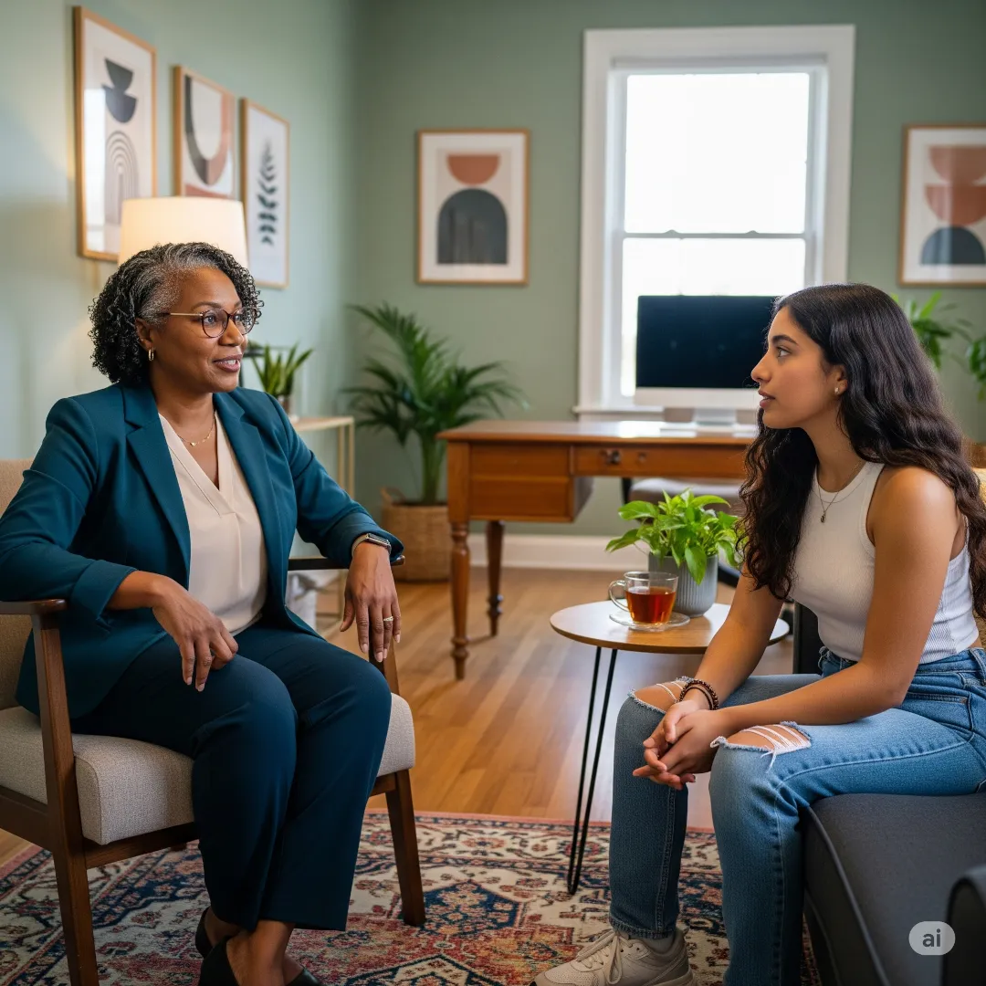 They pulled up to a small office building downtown. Dr. Richardson's office was on the third floorâa cozy space with soft lighting, comfortable chairs, and walls lined with books. She was a Black woman in her fifties with kind eyes behind wire-rimmed glasses and gray streaks in her natural hair.