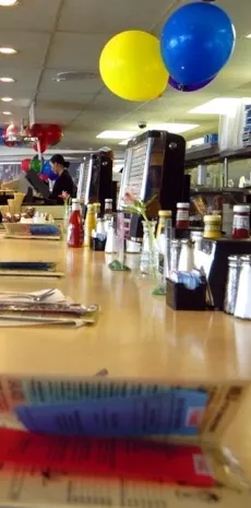 The waitress brings their ice cream and hands the check to Penelope. Penelope starts eating but then suddenly shoots a startled look at the waitress, who's returned to her position behind the counter.