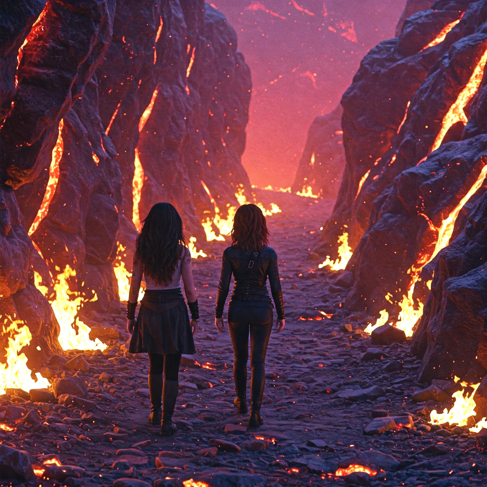 They carefully step out of the craft onto the rocky path. As they start walking, the TDC vortex and the craft disappear behind them. Theyâre alone in a barren landscape, like a fresh lava flow, with fire and hot rocks all around except for the cool spot where they stand. As they move forward, cool water rises from the ground, keeping the path safe for them to continue.
